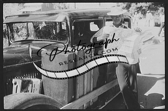Title: Florida migrants studying road map before leaving Elizabeth City, North Carolina for the state of Delaware