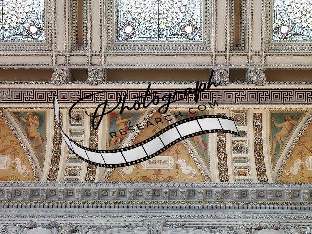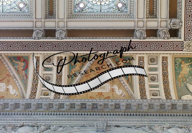 Title: [Great Hall. Detail of ceiling and cove showing sculpture of two female half-figures. Library of Congress Thomas Jefferson Building, Washington, D.C.]