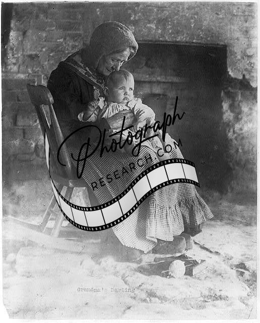 Grandma's darling,Elderly woman,rocking chair,baby,July 22,c1910,Fireplace
