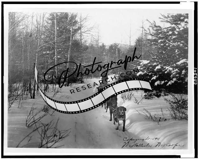 Man travelling,dogsled,transportation,teams,snow,trees,path,Alaska,AK,c1911