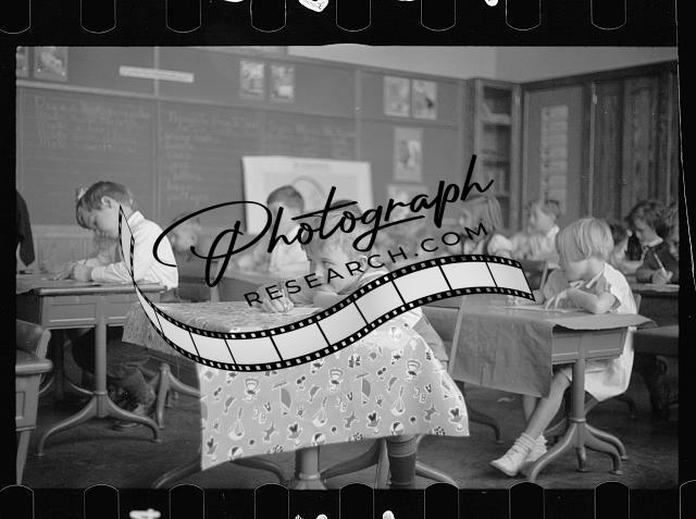 Greenbelt schoolroom,children,students,desks,boys,girls,tables,Maryland,MD,1937