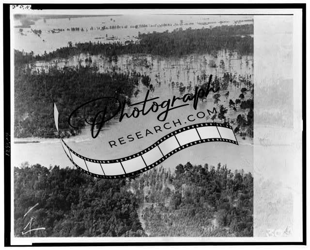 Summary: Aerial view of Greenville, much of which is partially submerged by floodwaters, levee in center, left background.