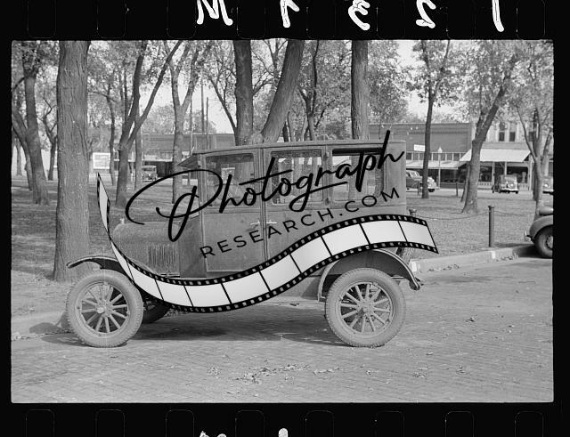 Car parked in front of county courthouse,Yates Center,Kansas,KS,1938,Vachon