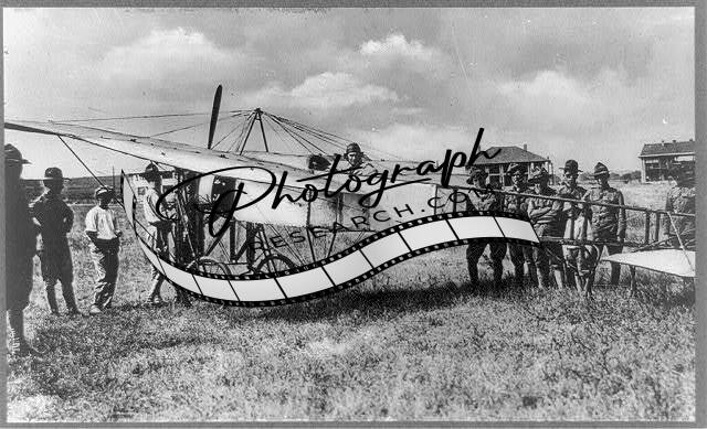 Early model airplane,soldiers,flying,Camp Logan,Houston,Texas,TX,1918