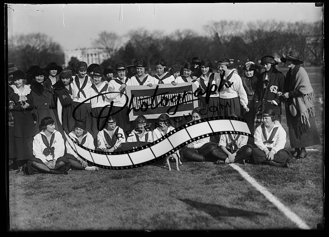Women with field hockey stick,dog,United States,Harris & Ewing