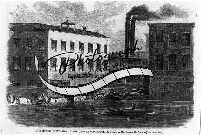 The recent inundation of the Ohio River at Cincinnati,flooded street,1862,boat