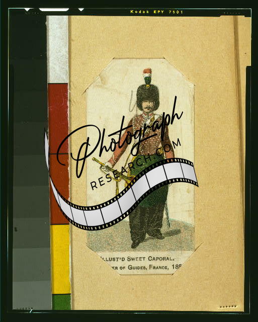 Summary: Print shows a French guide in 1853, wearing uniform, on cigarette card issued by Kinney Tobacco Company as an insert with the Sweet Caporal brand cigarettes.