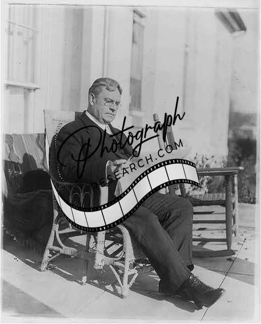 Hiram Warren Johnson,1866-1945,seated on patio,reading newspaper,glasses