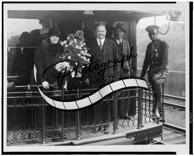 Summary: Herbert Hoover, Republican nominee for the Presidency, photographed with Mrs. Hoover on the back of a railroad car at Union Station, Washington, D.C.
