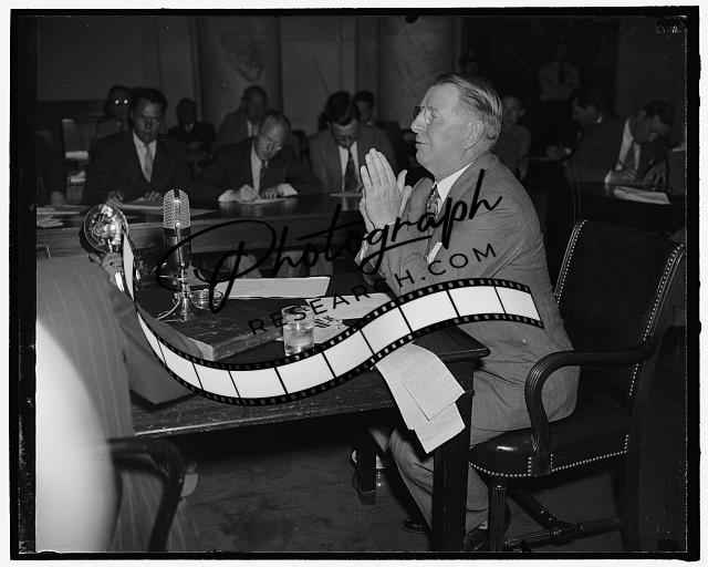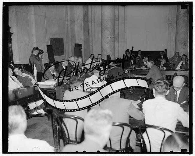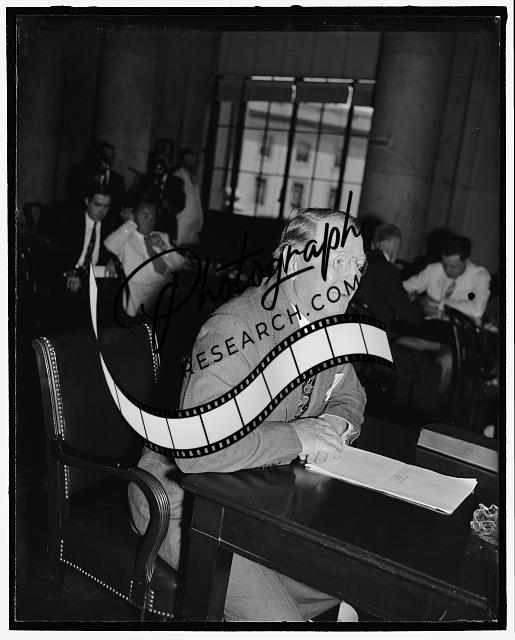 Title: Senate Military Affairs Committee. Washington, D.C., July 2. The Senate Military Affairs Committee which today be a vote of 14 to 3 approved the nomination [of] Henry Stimson to be secretary of war. Front row, left to right: Senators H. Styles Bridges, New Hampshire; Warren R. Austin, Vermont; Morris Sheppard of Texas, chairman; Robert R. Reynolds, North Carolina; Elbert D. Thomas, Utah; and Sherman Minton, Indiana. Back row, left to right: Senators Chan Gurney, South Dakota; Lister Hill, Alabama; A.B. 'Happy' Chandler, Kentucky; John Thomas, Idaho; H.H. Schwartz, Wyoming; Edwin C. Johnson, Colorado; and Sheridan Downey, Calif., 7-2-40