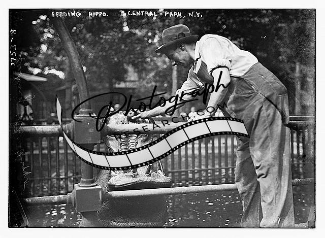 Central Park,New York,feeding hippo,man with hand on hippo's mouth,1910-1915