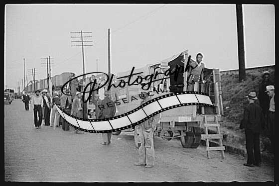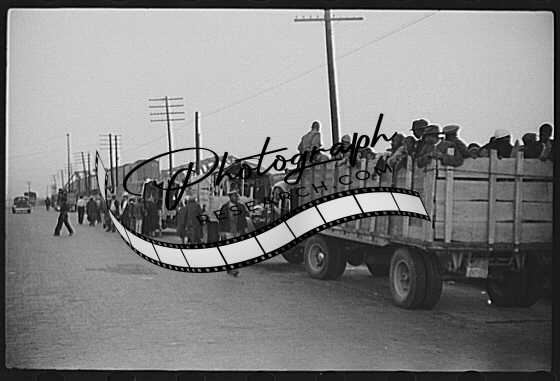 Title: Day laborers being hired for cotton picking on Mississippi and Arkansas plantations. Between four and six-thirty every morning during the season, near the Hallan Bridge in Memphis, Tennessee, crowds of Negroes in the streets gather and are loaded into trucks by drivers who bid, and offer them anywhere from fifty cents to one dollar per day