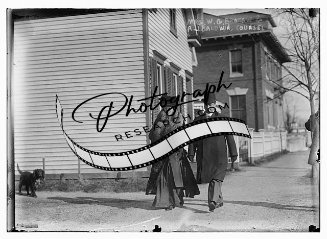 Mrs. W.G. Brokaw,her counsel A.J. Baldwin walking on sidewalk,December 1909