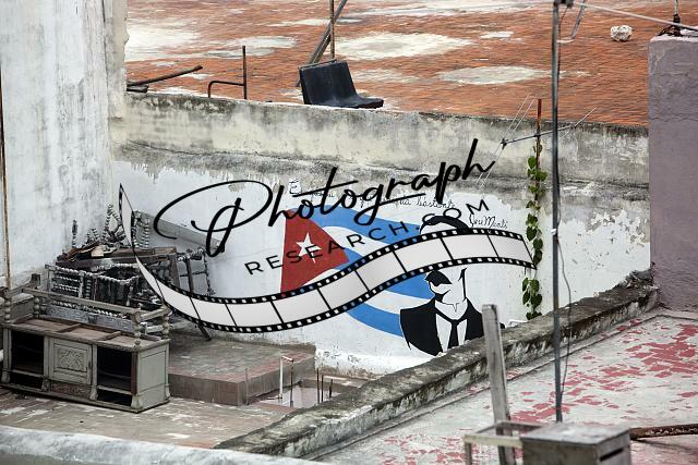 Title: Hand painted mural showing the Cuban flag and Che Guevara, neighborhood in Old Havana, Cuba