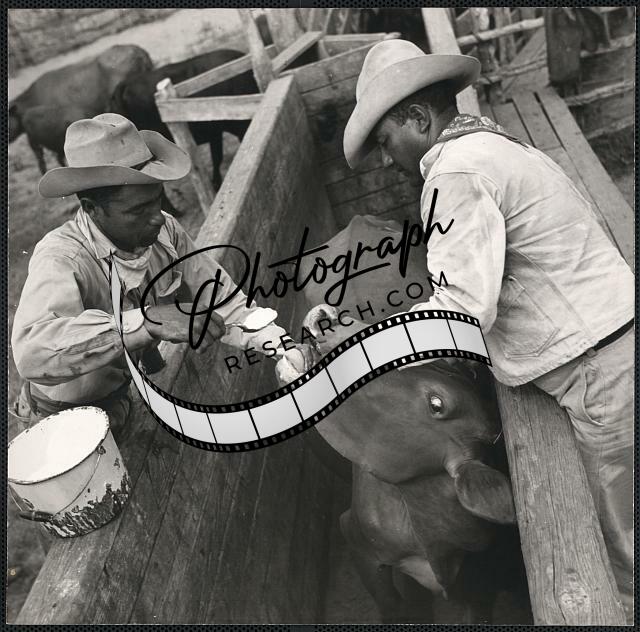 Vaqueros spoon-feeding phosphorus to a cow, King Ranch, Texas