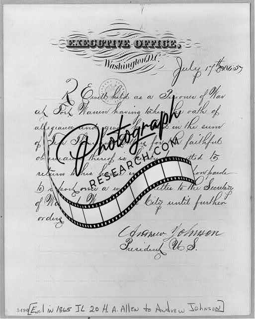 Photo,Letter,Andrew Johnson,July 17,1865,paroling R. Ewell from Fort Warren