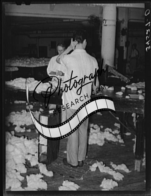 Title: Unloading bales of cotton from truck-drawn trailers at compress, Houston Texas. Cotton was transported to the compress from Oklahoma in large trucks in background