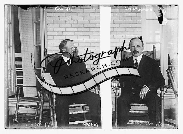 Governor Hay,Governor McGovern,both seated in rocking chair on porch