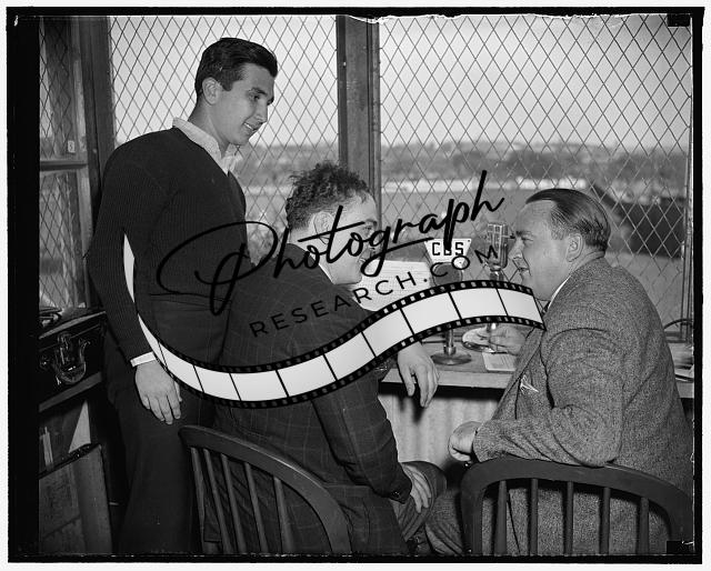 Title: Last minute huddle. Washington, D.C., April 20. Loaded down with facts and figures on President Roosevelt's $4,512,000,000 Recovery Drive, WPA Administrator Harry Hopkins (left) and his First Assistant Chief Aubrey Williams, await the opening of The House Appropriations Committee Hearing today where they made public plans for the Administration's new drive against The Depression, 4/20/38
