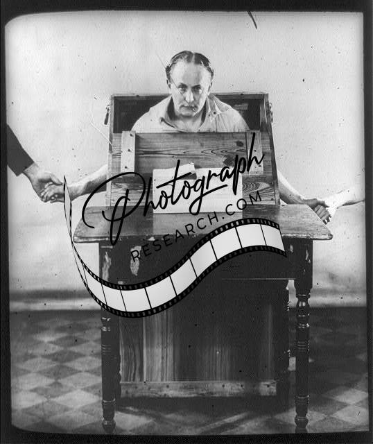 Harry Houdini,box,head,arms sticking out,table,magic,performances,magician,c1926