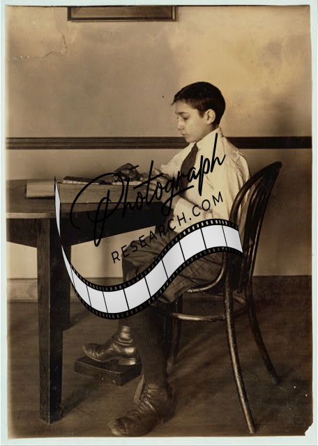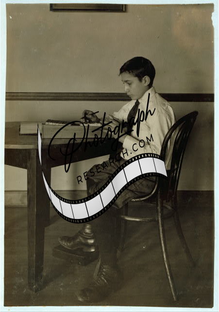 Title: Unfavorable working position standing. No support for the shorter limb. Boy obliged to lean against the wall for support. Body not properly balanced. It continued to do standing work without support of crutch, hip would cause boy constant pain. Need for advice of examining physician. Lewis W. Hine. See 4659, 4661, & 4662. Location: Boston, Massachusetts.