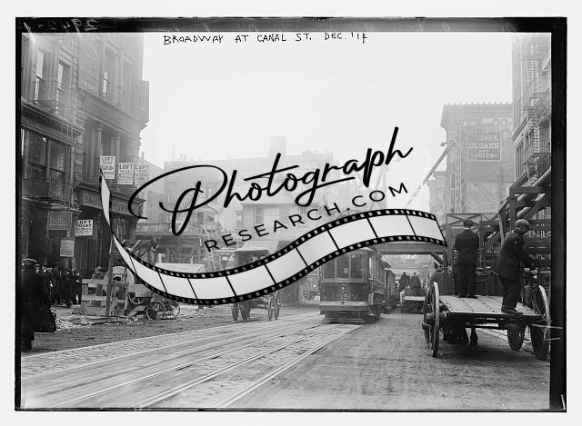 Broadway at Canal Street,December 1913,trolley car,horse drawn wagon,storefronts