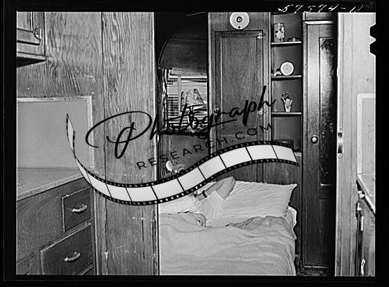 Title: Frank Robbins of Wareham, Massachusetts, employed at United Aircraft, East Hartford, Connecticut, lives in trailer near plant, with wife and four children because of housing shortage. He works nights, so he can sleep days in a bed used at night by the children. He makes forty dollars a week, his trailer payment is twenty dollars per month, and twelve dollars rent for the campsite