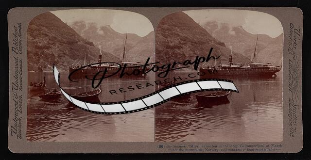 Steamer "Mira" at anchor in the deep Geirangerfjord at Marok, under the mountain