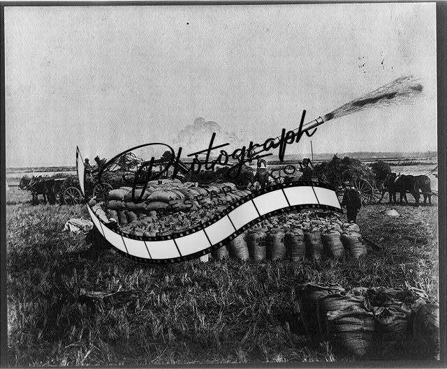 Threshing machine,in operation,Bags of Grain,Men,Horses