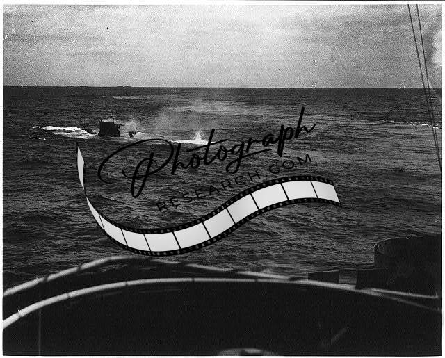 The U.S. Coast Guard cutter SPENCER opens fire on the Nazi U-Boat, lying dead ahead in relatively calm seas. The submarine was blown to the surface by the Coast Guard combat cutter's depth charges