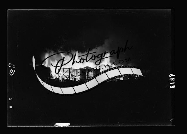 Night incendiary of coal,lumber yards near railroad station,Middle East,1938