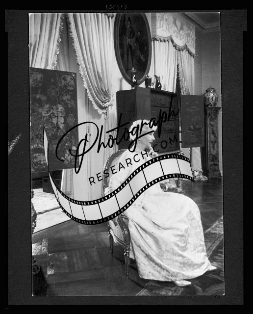 Photograph shows portrait of Consuelo Vanderbilt Balsan seated in a lavishly furnished room.
