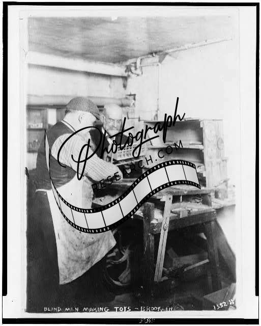 Blind man making toys,Brooklyn,New York,NY,toy making workshop,two men,c1915