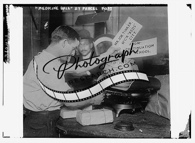 Medicine ball being weighed by Post Office employee,Mr. Joe Tinker,Basbeall