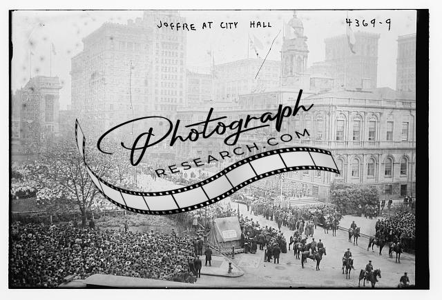Joffre at City Hall,crowd gathered,buildings,Bain News Service