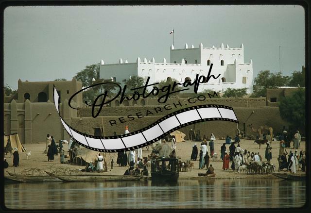 People, animals, and boats along the Niger River in Mali; in background, mud brick walls and buildings, including large white building flying the French flag