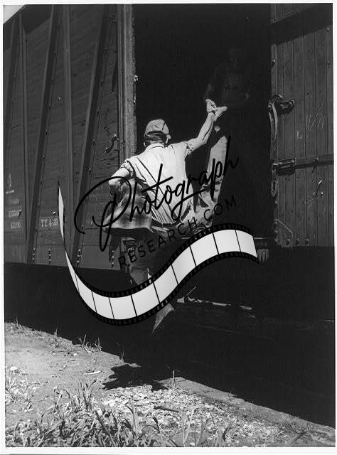 Man helping,hop,freight car,freighthopping,travel,Bakersfield,California,CA,1940