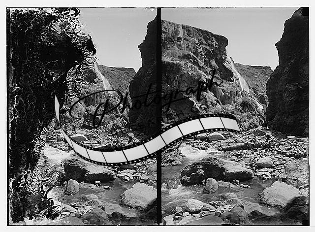 Title: Herod's hot baths of Callirhoe. Wady Zerka Main. The waterfall and bathers' camp