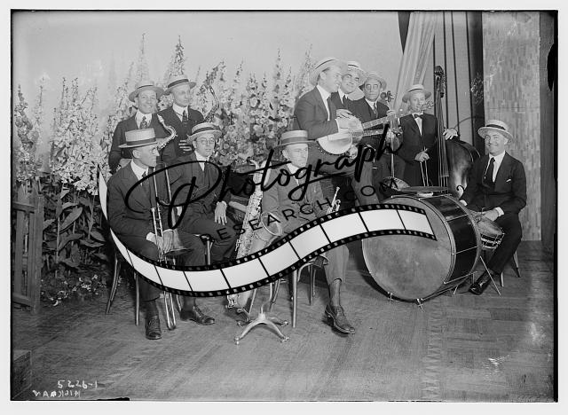 Hickman,instruments,musicians,drums,trombones,stage,performers,Bain News Service