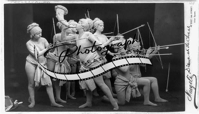 Diana,chase,Roman deity,Tableaux,myths,people,body suits,bows,arrows,horn,c1885