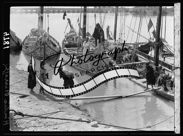 Title: Iraq. Hindiyah Barrage. About 48 miles S.E. of Baghdad. Row of 'Bellums,' river boats in foreground