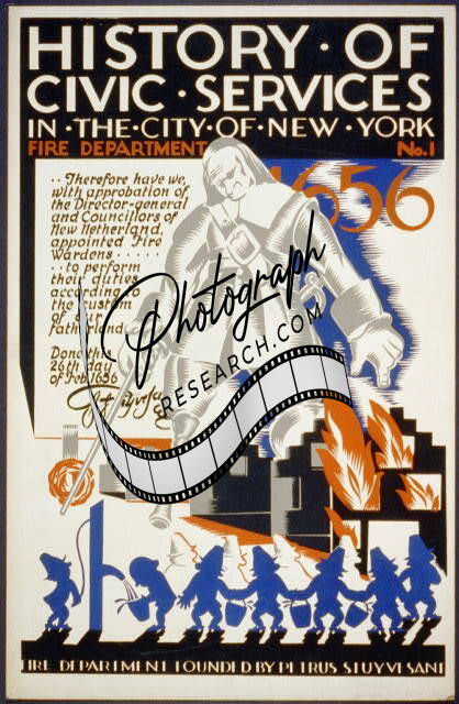 Summary: Poster for Federal Art Project series on the history of civic services, showing water being drawn from a well outside a fort in 'New Amsterdam' in 1658.