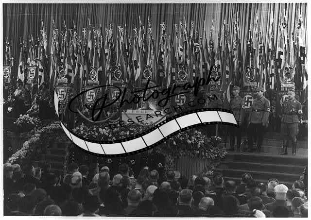 Hitler speaking, Apr. 2, 1938; massed flags behind podium, Munich