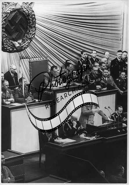 Adolf Hitler, speaking at Reichstag meeting, Apr. 28, 1939, Göring and others in background