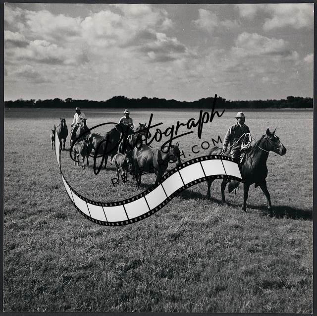Three vaqueros leading in three horses with their colts, King Ranch, Texas