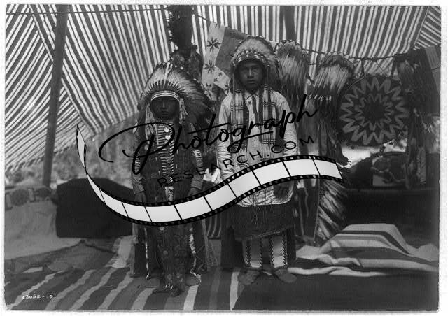 Sons,Yakima chief,clothing,headdress,Indians,Native Americans,WA,E Curtis,c1910