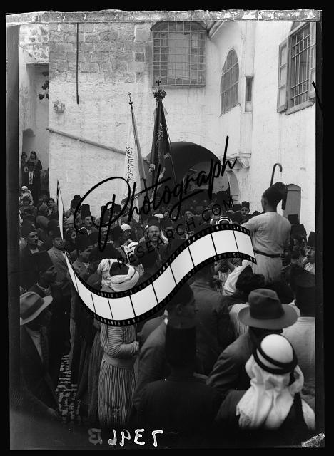 Title: Holy Fire crowds. Lyd banners on way to [Church of the Holy] Sepulchre