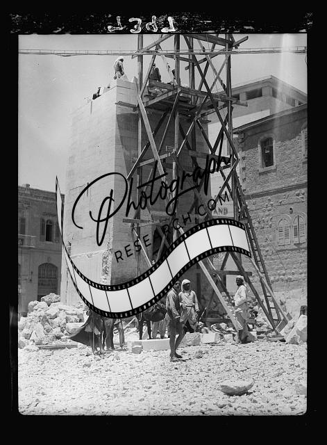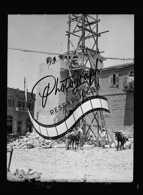 Taking down clock tower. Old P.O. square Jerusalem?,Israel,Middle East,1936,1