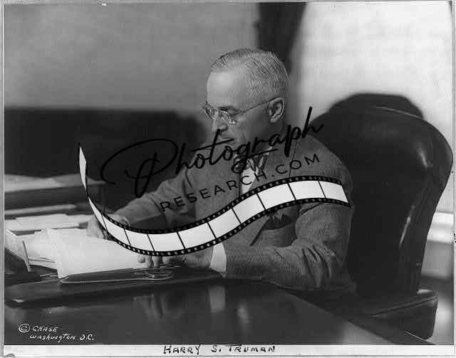 Harry S. Truman,1884-1972,seated at desk,pen,papers