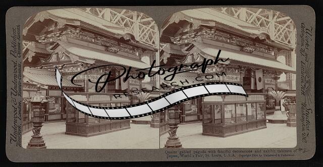Quaint gabled pagoda,exhibit cabinets of Japan,World's Fair,St. Louis,U.S.A.